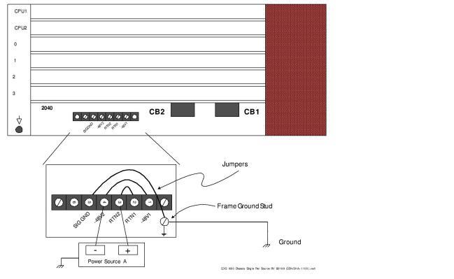 You connect the external power source to the chassis at the terminal block (Terminal Block – Factory-Installed Wiring ) on the Power Input Panel. The factory-installed wiring configuration enables you to connect a single power source to the chassis without adjusting the jumpers.