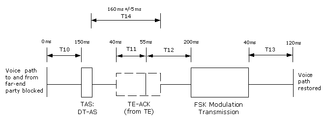 The DT-AS must precede the FSK modulation transmission between a minimum of 45 ms and a maximum of 500 ms (T4). The LE re-establishes the condition existing before the TAS is sent between a minimum of 200 ms and a maximum of 500 ms (T8) after FSK modulation transmission is stopped. The lower limit is required to enable the TE to apply and remove the appropriate circuit for data reception.
