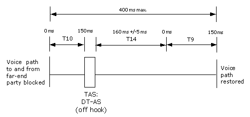 Note: If a SAS is sent and the voice path has been blocked before the SAS is complete, either of following conditions would occur: • If the voice path is restored between the SAS and TAS, then T10 is the time between the latter voice path blocking and the beginning of TAS being sent. • If the voice path is not restored between the SAS and TAS, then T10 will start at the end of the SAS. |