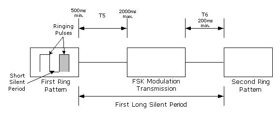 The FSK modulation transmission starts between a minimum of 500 ms and a maximum of 2000 ms (T5) after the end of the first ring pattern. The second ring pattern starts at a minimum of 200 ms (T6) after FSK modulation transmission has stopped. The lower limits are required to enable the TE to apply and remove the appropriate circuit for data reception.