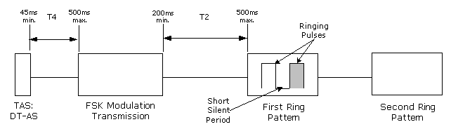 The DT-AS must precede the FSK modulation transmission between a minimum of 45 ms and a maximum of 500 ms (T4). The first ring pattern occurs between a minimum of 200 ms and a maximum of 500 ms (T2) after FSK modulation transmission has stopped. The lower limits are required to enable the TE to apply and remove the appropriate circuit for data reception.