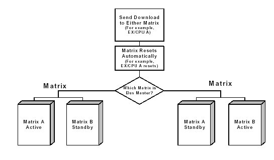 If Matrix Controller card A in has control of the bus after the download finishes, the following occurs, as shown in Downloading to Redundant Matrix Controller Cards: