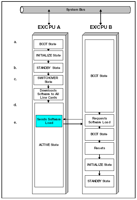 If any of the above conditions occurs, the Matrix Controller gains control of the system bus and enters the Switchover state. The Matrix Controller then gains control of the CSP and enters the Active state, and the system software immediately enters the Switchover state.