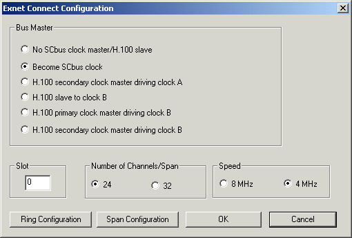 6 Select the Bus Master. Enter the Slot number (The valid range is 0-31). Select the Number of Channels/Spans and the Speed when configuring an EXNET - PCI/H100 node.