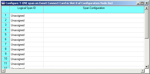 10 When the focus returns to the Exnet Connect Configuration dialog box, click the Span Configuration button. The Configure T-ONE span on Exnet Connect Card ... dialog box opens. Or, if you selected 32 channels in the Exnet Connect Configuration dialog box, the Configure E-ONE span on Exnet Connect Card... will open. For more information on configuring these line cards, see the procedures on Configuring the T-ONE Card or Configuring the E-ONE Card in the Converged Services Administrator User’s Guide, release 8.1.1 CI. See the next screen shot for an example of a Configure T-ONE span... dialog box.