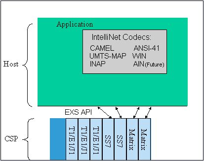 The IN and wireless application and codecs reside on the host computer using the SS7 services of the CSP.