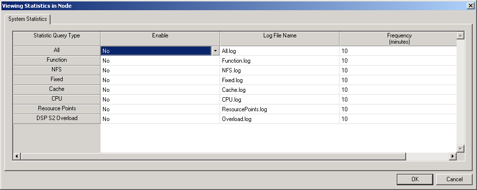 2 To make modifications to DSP Series 2 entities after you query, select a row and then either choose from the drop-down list for Enable or delete and enter new text in the Log File Name and Frequency fields. Click OK.