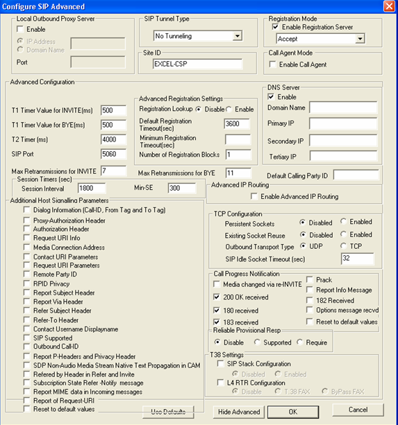 By disabling the DNS Server, all outbound SIP calls that require DNS lookup fail and be indicated by a NACK value of 0x1312. This NACK value applies to the Outseize Control (0x002C) and Route Control (0x00E8) messages.