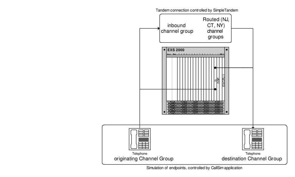 The CallSim application simulates the endpoints of a tandem call and manages two channel groups, the originating channel group and the destination channel group.