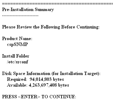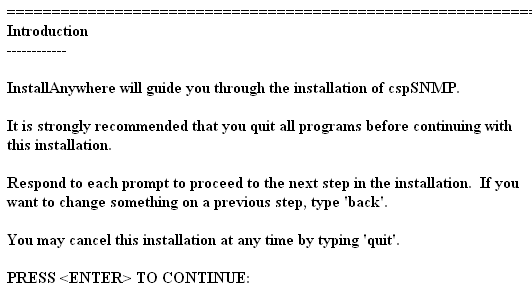 4 The following shows the screen output of InstallAnywhere. When you are asked to press enter to continue, do so: