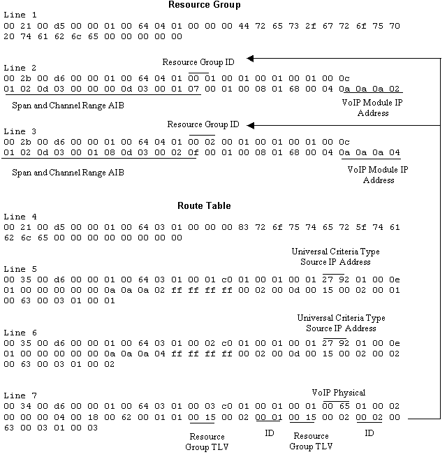 6. Line 2 maps VoIP Module IP Address 0a 0a 0a 02 to span 0000, channel 00 through span 0001, channel 07. Line 3 maps the VoIP Module IP Address 0a 0a 0a 04 to span 0001, channel 08 through span 0002, channel 0f.