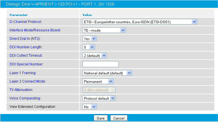 When you select Configuration or click the name of the Diva Media Board, the Board Configuration - Detail page opens and you may configure the basic and extend parameters of the Diva board. To see the extended parameters, select Yes next to View Extended Configuration.