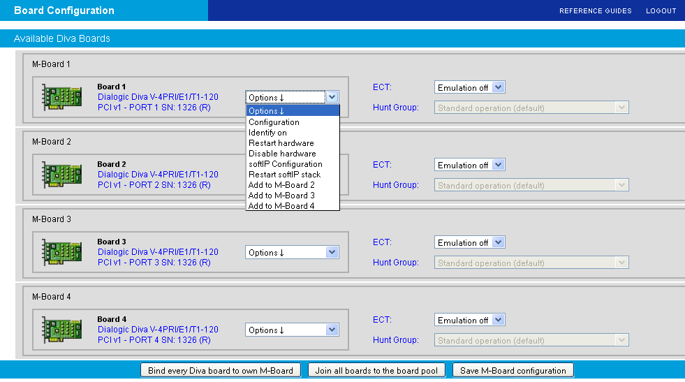 Create/change the configuration of the Diva Media Boards or the Diva softIP board. To do so, either click the highlighted name of the board or select Configuration or softIP Configuration from the drop down menu next to the board name to open the Board Configuration - Detail page. For more information, see the description below the screen.