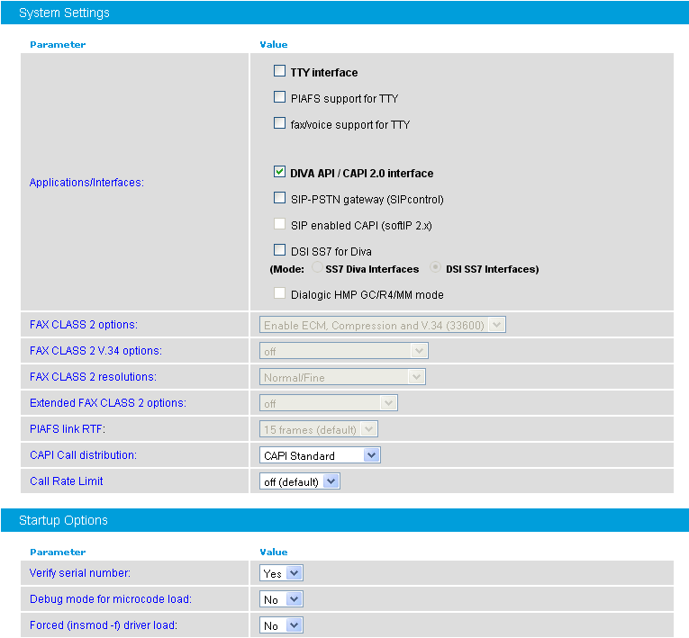 If you click System configuration on the left hand side, a page opens that allows you to configure global system parameters that affect the installed boards and device drivers, to optimize the configuration of your system, such as Fax-, RAS-, or Voice server, to select the applications and interface drivers to be loaded (CAPI, TTY), and to control misc. system services (accounting, etc.).