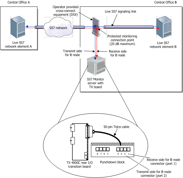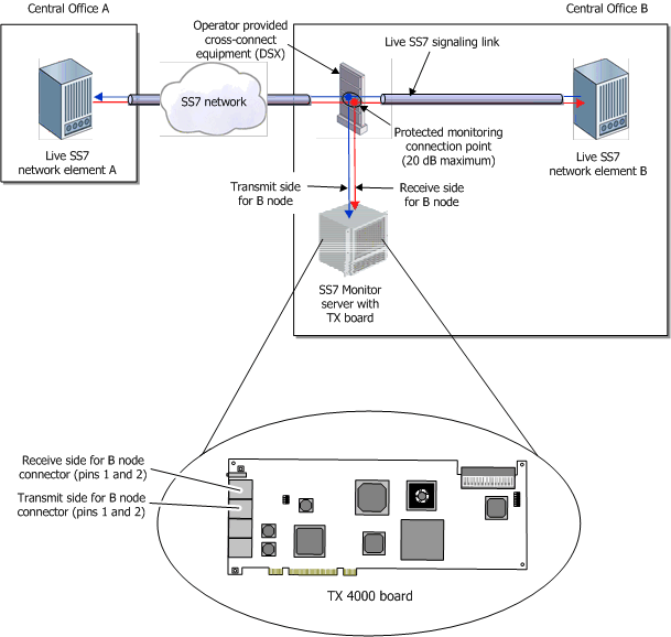 The following illustration shows how to connect the monitor server with an installed TX 4000 board to the SS7 network and monitor SS7 traffic:
