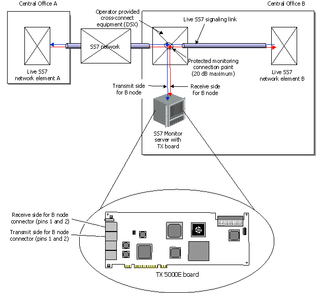 The following illustration shows how to connect the monitor server with an installed TX 5000E board to the SS7 network and monitor SS7 traffic: