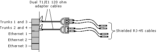 Connect shielded RJ-45 cables directly to the trunk connector on the board or to the dual T1/E1 trunk adapter cable.