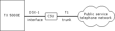 For typical T1 communications, each trunk interface connects to a channel service unit (CSU), which is connected to a T1 trunk line. The CSU provides a DSX-1 interface to the T1 line, and also contains circuitry that enables the central office (CO) to perform diagnostic tests remotely. The following illustration shows the TX 5000E board trunk interface with CSU: