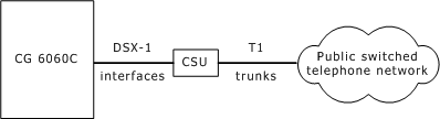 CG 6060C boards configured as T1 have up to sixteen DSX-1 trunk interfaces. For typical T1 communications, each trunk interface connects to a channel service unit (CSU) that is connected to a T1 trunk line. The CSU provides a DSX-1 interface to the T1 line and also contains circuitry that enables the central office to perform diagnostic tests remotely.