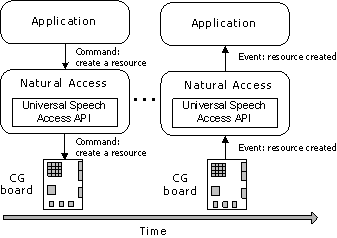 As shown in the following illustration, for asynchronous functions, NaturalAccess sends a command to the API, which sends a command to a telephony board. The board performs the requested functions and sends events to the service indicating its state (for example, the function was started or the function is complete). The API sends events to NaturalAccess, which makes them available to the application. The following illustration shows NaturalAccess and the Universal Speech Access API interaction: